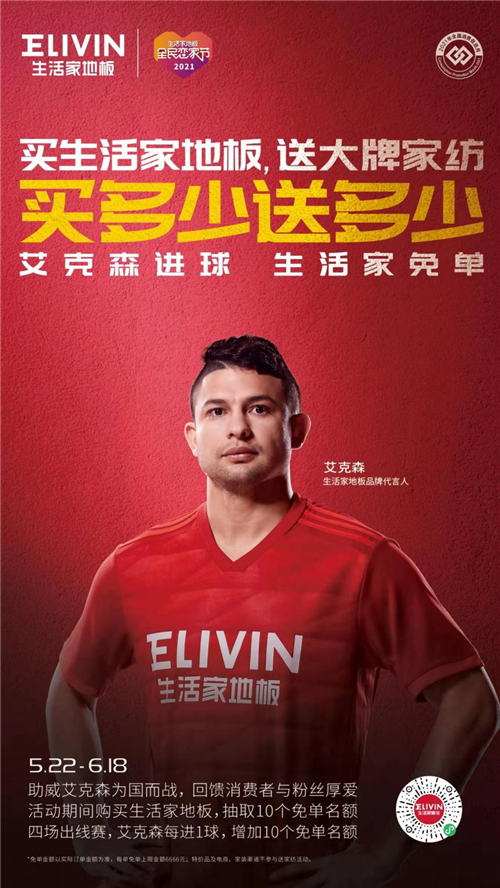 如果你覺(jué)得這份豪禮還不夠大,生活家地板還有第二重豪禮放送。所謂趕早不如趕巧,全民”戀家節(jié)“期間,正值中國(guó)隊(duì)2021年世預(yù)賽40強(qiáng)舉行,艾克森作為生活家地板品牌代言人,同時(shí)也是中國(guó)足球運(yùn)動(dòng)員,為了給他助威打call,生活家地板推出了“艾克森進(jìn)球,生活家免單”活動(dòng)。活動(dòng)期間購(gòu)買(mǎi)生活家地板,抽取10個(gè)免單名額,四場(chǎng)出線賽,艾克森每進(jìn)一球,增加10個(gè)免單名額,免單幾率非常大;每單免單上限金額為6666元,超強(qiáng)優(yōu)惠,給你超值體驗(yàn),鉅惠福利盡在生活家地板!