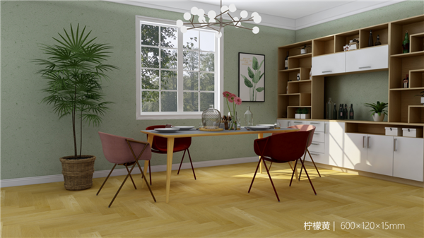 國際流行的暖色系檸檬黃地板,給人帶來柔和舒適的視覺體驗;采用零醛基材鍛造,給健康家居增添一道綠色屏障;魚骨拼鋪法,借助無縫拼接工藝,在縱橫交織的紋理中,生動展現直撩心底的家居美景。