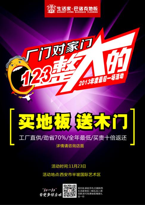 西安生活家2013年度最大優惠壓軸呈現!買地板,送木門!工廠直供,勁省70%,全年最低。11月23日,與您相聚西安半坡國際藝術區。
