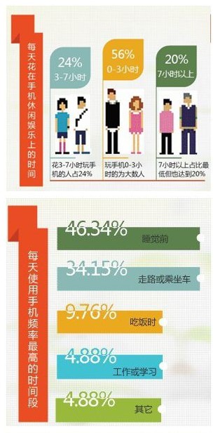 人們什么時候最愛玩手機?“睡覺前”這一選項以46%的比例在所有時間段中高居首位。原本是睡覺的時間,很多人卻玩興正濃,手機既打擾了正常的生活規律,更會導致第二天的精神萎靡。