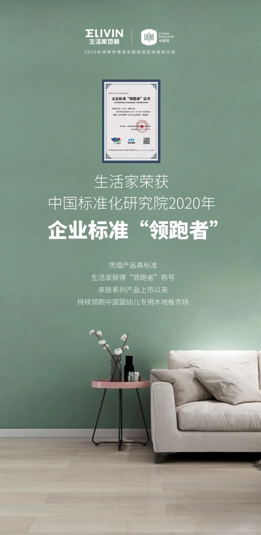 12月19日,中國標準化研究院聯合相關行業協會于2020年12月19日在北京成功召開了2020年企業標準“領跑者”大會。會上,生活家地板榮獲2020年企業標準“領跑者”稱號。