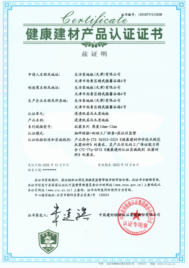 近日,生活家極地系列納米鹽抗菌地板,正式獲得CTC(中國建材檢驗認證集團股份有限公司)頒發的健康建材認證證書,證書編號10920P37652ROM,發證日期為2020年12月9日。