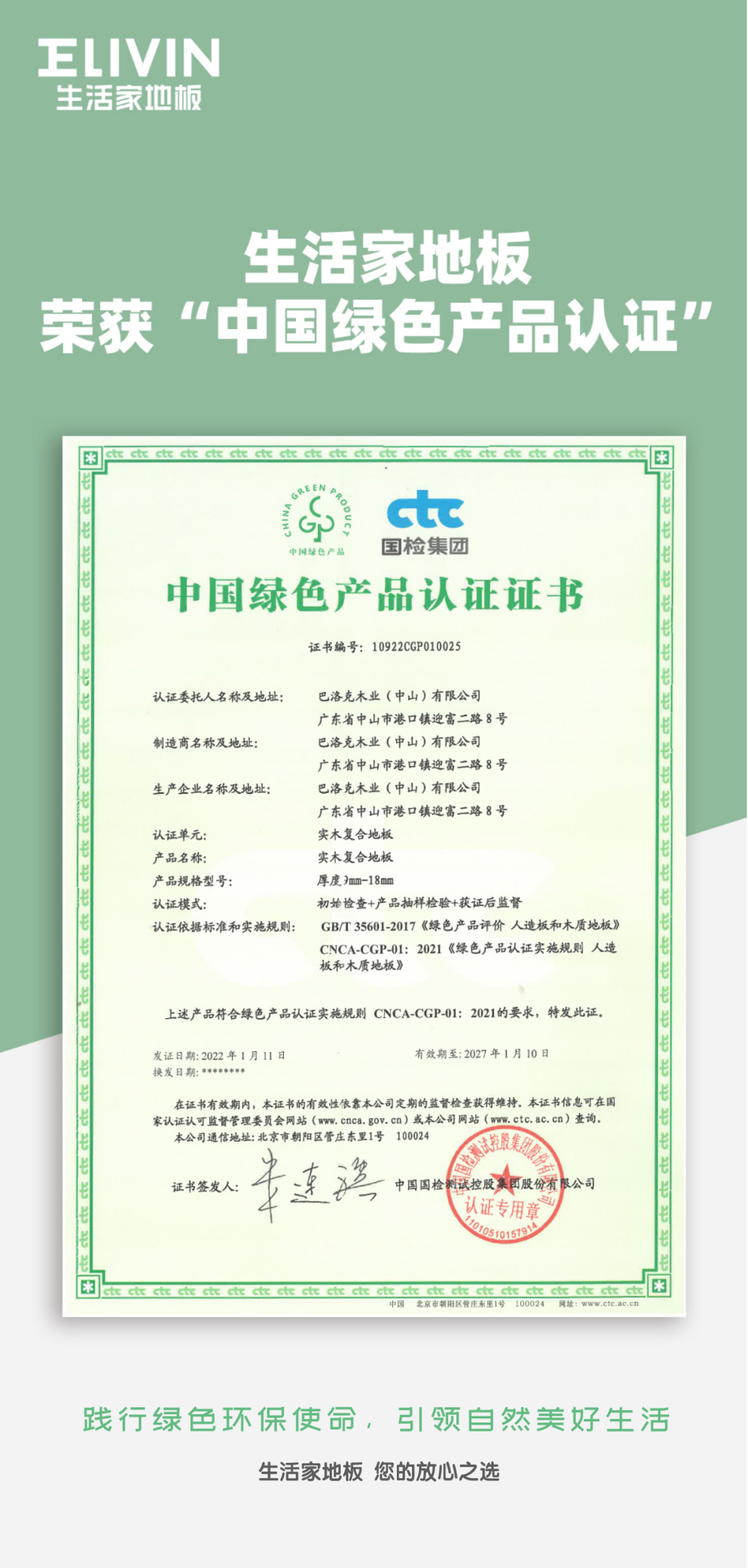 近日,生活家地板憑借卓越實力,獲得由國檢集團(CTC)頒發的中國綠色產品認證證書,通過綠色生產,打造綠色產品,支持和助推國家綠色發展道路。
