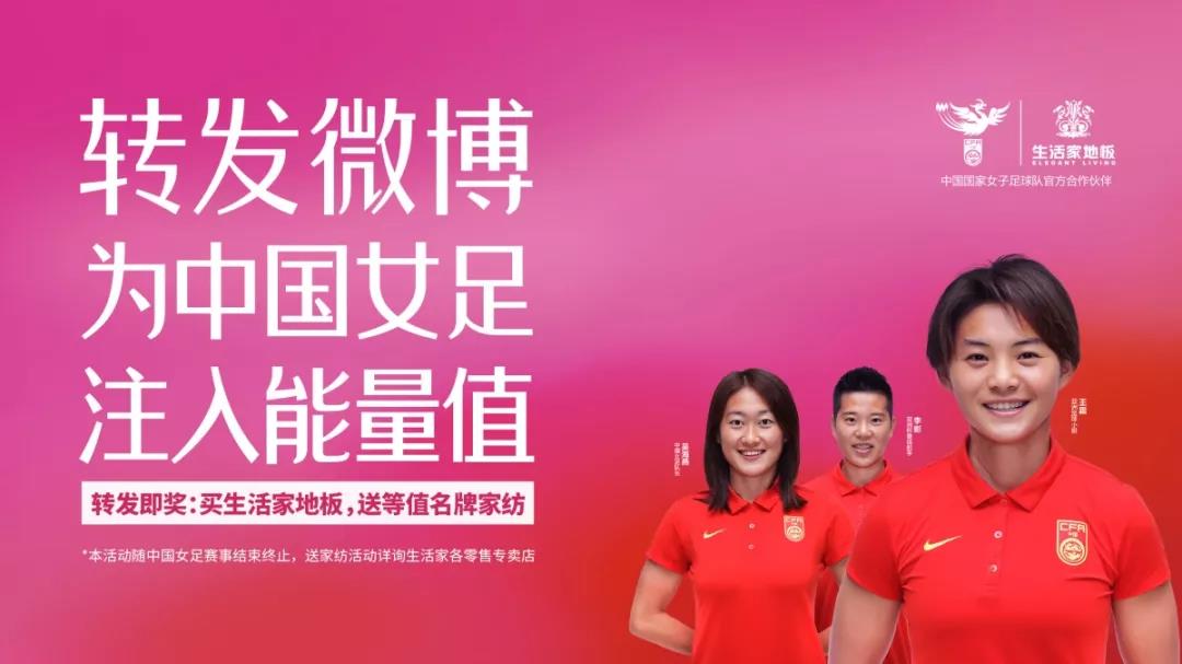 從巴洛克文化到戀家文化,生活家一直倡導高品味的生活方式和積極的生活態度,不僅是把高品質的產品帶給千家萬戶,還賦予了產品更多的文化內涵,為消費者帶來超越產品本身的價值體現。20191月,生活家地板成為中國女足官方合作伙伴。刻苦頑強的拼搏精神、精誠一致的團隊精神、永不放棄的挑戰精神,是雙方精神上的契合,也是理念上的契合。5-6月,為呼吁全民關注女足,助力中國女足發展,法國女足世界杯期間,生活家地板在新浪微博發起了#轉發微博為中國女足注入能量值#的線上線下聲援行動,迎來了4.5億次曝光,數百萬網友參與討論,近50萬位網友自主轉發微博,為中國女足積極打call