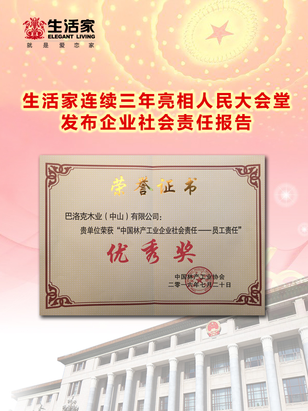 2016年7月20日,由中國林產工業協會同中國林業產業聯合會聯合舉辦的“2016年度中國林產工業企業社會責任報告發布會” 在北京人民大會堂隆重召開。繼2014年以來,生活家第3次受邀參加了大會,與其他7家林產業骨干企業聯袂發布了“企業社會責任報告”。此次大會,生活家以精益求精,以匠心精神打造百年老店為主題的報告榮獲《中國林產工業企業社會責任-員工責任》優秀獎。