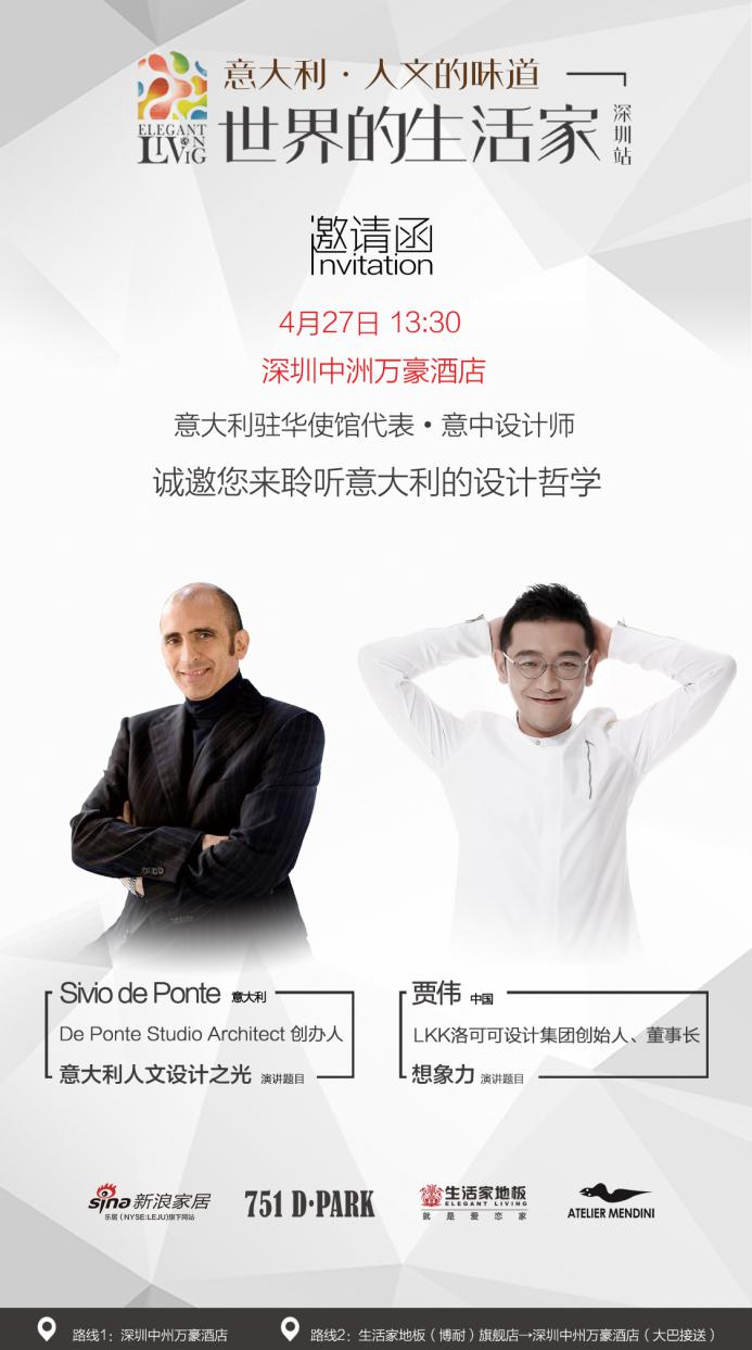 2017年427日下午兩點(diǎn),“世界的生活家”第二站將于深圳中洲萬豪酒店舉辦。活動(dòng)由生活家地板、新浪家居、北京751主辦,門迪尼工作室聯(lián)合主辦,意大利著名建筑師Silvio De Ponte和中國(guó)設(shè)計(jì)明星賈偉將站臺(tái)演講,意大利領(lǐng)事館文化官員Beatrice Sbrollini也將出席本站活動(dòng)。