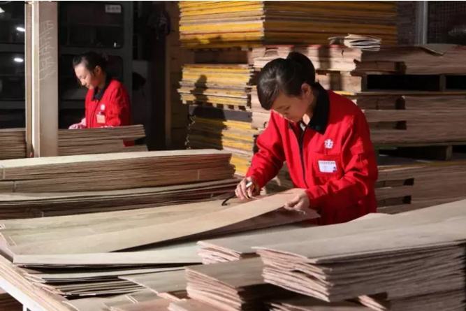 (工人用尺子測量木皮的寬度)