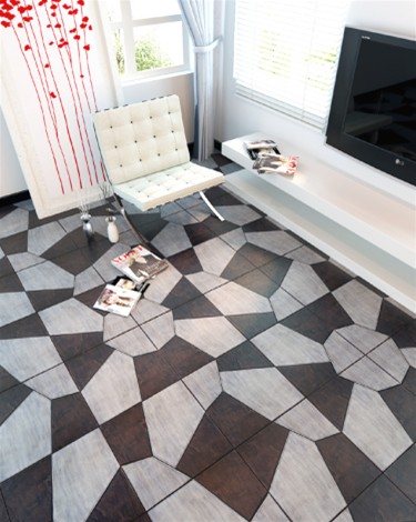常規的家具比例已經讓人感到沉悶,一些家具以非常規的甚至是夸張的比例出現在居室中,強烈的跳躍感使整個空間充滿了夢幻色彩。在2012年已經出現的幾何主義系列地板就以圓錐、弧線等不規則的幾何圖案,打破了人們對地板“方形”概念的認知,成為魔幻趨勢在地面藝術領域的發端。