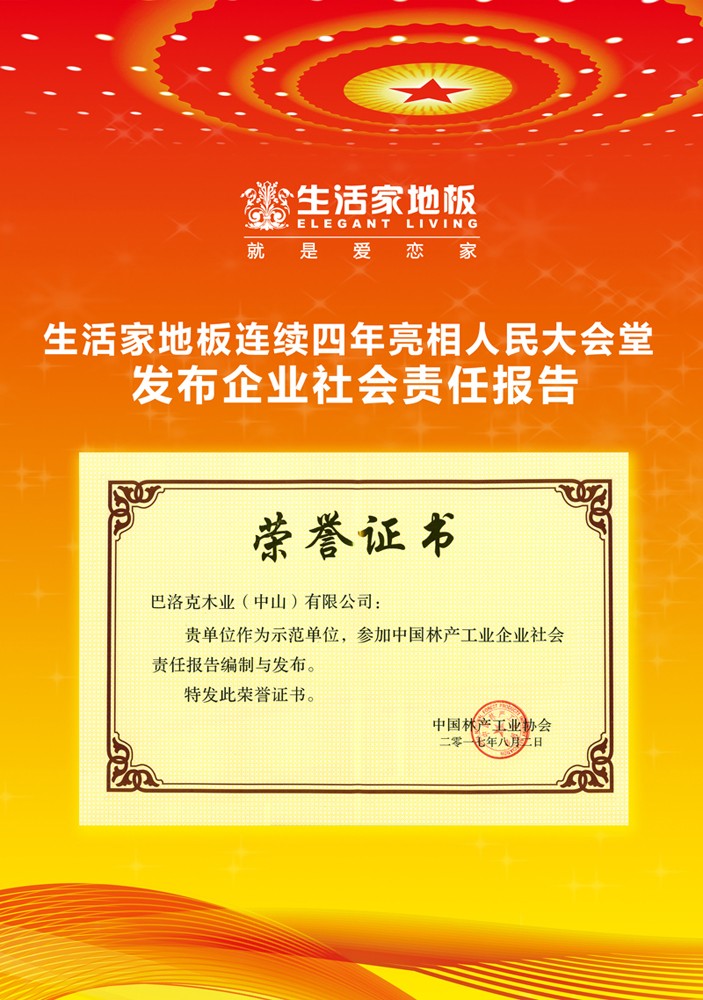 8月2日,《中國林產工業協會社會責任報告》在人民大會堂正式發布。生活家受邀參加了大會,與其他14家林產工業骨干企業聯袂發布了“企業社會責任報告”,并被授予“中國林產工業企業社會責任報告編制與發布示范單位”。這是生活家連續4年亮相人民大會堂發布企業社會責任報告。